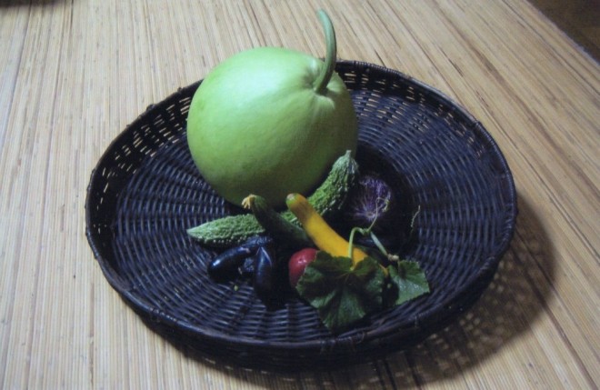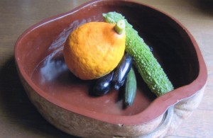 丸夕顔・・・「フクベ」とも言われ、丸い大型でこれも生のまま煮たりするが、熟すると皮が堅くなるので器物として利用されたりします。この夕顔の皮をむき干したものが「干瓢」となります。