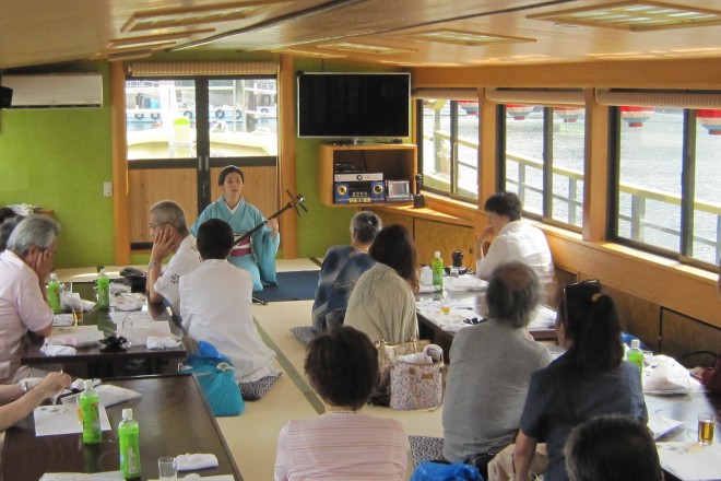 今日はあるカルチャースクールの頼まれ屋形船イベントでありました。昨日の天気予報では雨マークでしたからとても心配していましたが、天気もよく暑かったです。柳橋の亀清楼でランチをしてそのあと鈴木屋さんの屋形船で浜離宮へ。浜離宮で停泊して柳橋ご出身の千紫巳恵佳さんの小唄を楽しみました。