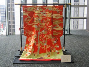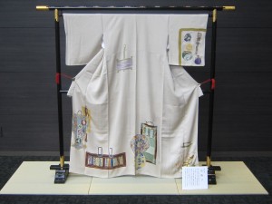 大羊居さんのきものも展示しました。写真ではわからないですが刺繍が施されていてとても贅沢でラグジュアリーさを感じられるきものです。とても素敵です。