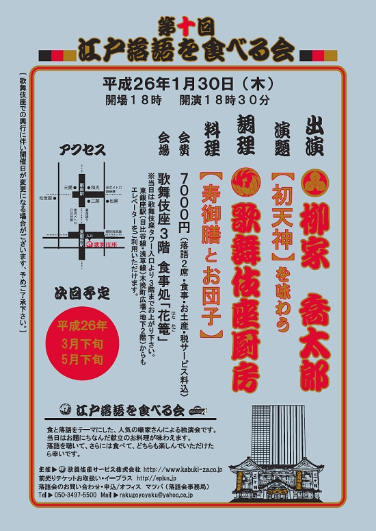 「落語を食べる会」が十回目の開催になるそうです。10回目の節目という1月は、今回が初登場となる柳家喬太郎師匠。お正月に因んだ演題は、『初天神』、料理は「寿御膳とお団子」。とても素敵な内容ですね。そしてチラシもかわいい。