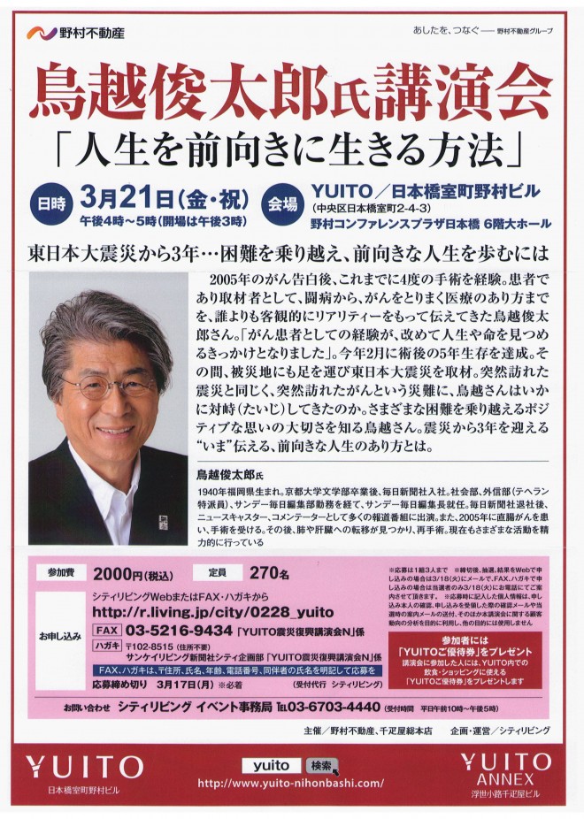 日本橋三越前にあるYUITO(ユイト)では、毎年3月に東日本大震災を振り返り、未来へ向かっていくために、講演会(主催:野村不動産株式会社)が開催されています。今年のゲストは、がんという病を乗り越えた評論家の鳥越俊太郎さんです。ぜひお出かけください。