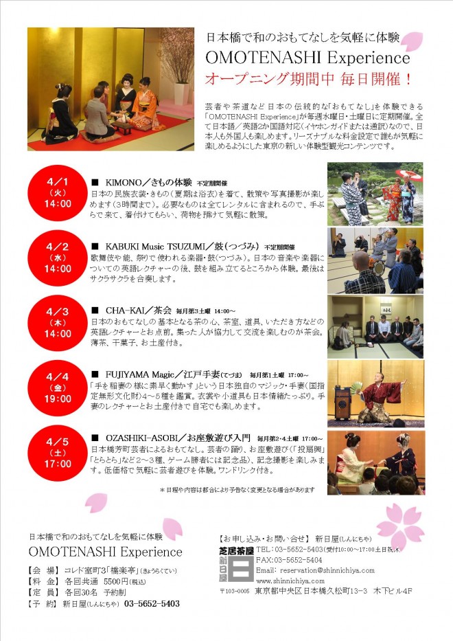 4月1日(火)から4月5日(土)の5日間。コレド室町2、コレド室町3のオープニング期間として「OMOTENASHI Experience」、KIMONO、TSUZUMI、CHA-KAI、FUJIYAMA Magic、OZASHIKI-ASOBIを毎日開催します。是非お越しください。日本人も外国人も一緒に楽しめる内容にしております。