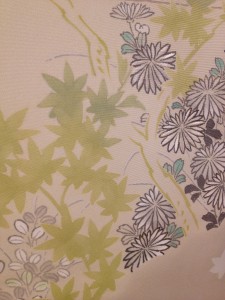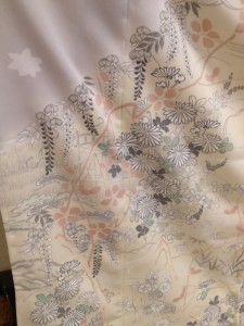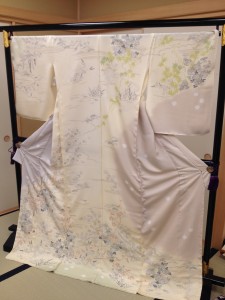 今月の逸品きものは写真の訪問着。素朴なはずの一珍染めの着物ですが、教室からおもわずため息がでるほど、上品に洗練された着物でした。
