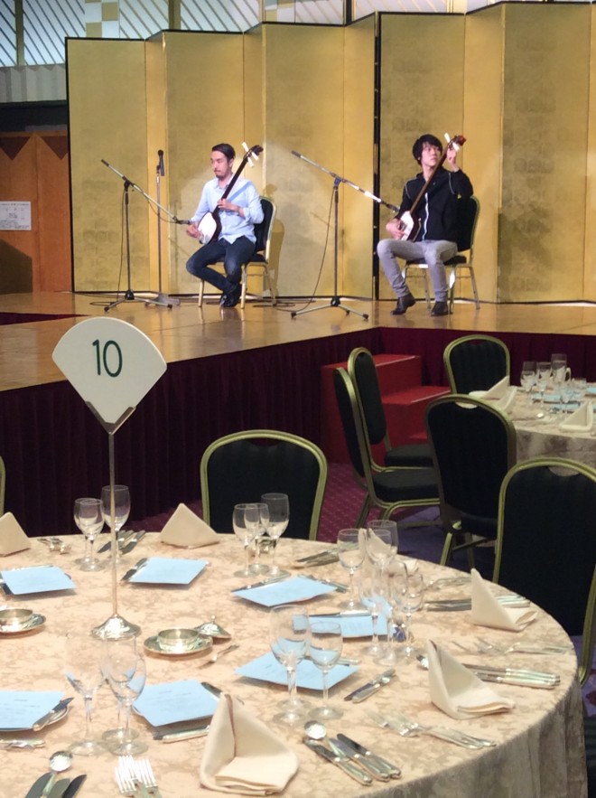 どのような会場で、どのような客層に向けてどんな芸能を入れるかをコーディネートするのが弊社の仕事でもあります。今回は目黒にある目黒雅叙園。大きな会場で宴会の少しざわついたお席の企画で、お客様のほとんどが着物の女性。そんな時はやはり若くてかっこいい津軽三味線奏者の小山さんは適任です。話も面白いし、演奏に勢いがあるからお客様も元気をもらえます。今回も喜んでもらえました。