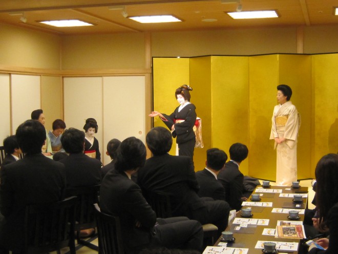 コレド室町2、3が完成して、さらに福徳神社も完成し、すこしづつ日本橋も訪日観光に目覚めてきました。今日も観光系のお役所の方が日本橋に来て頂きました。いつもは土曜日の夜に開催の「おもてなしエクスペリエンス」を特別にお昼に開催。お役所の方にも芸者の踊りやお座敷遊びを楽しんでもらいました。少しでも印象に残る日本文化体験をさせたいと思っています。芳町芸者の久和さんには英語で皆様に挨拶してもらいました。