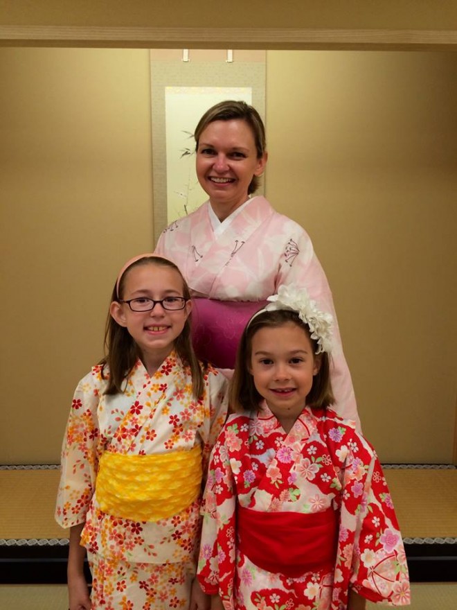 毎週の土曜日、日本橋のコレド室町の橋楽亭で外国人旅行客にきものレンタルをしています。今日も素敵なアメリカの女性が3人。親子だそうで、これからお父さんと待ち合わせしているとのこと。