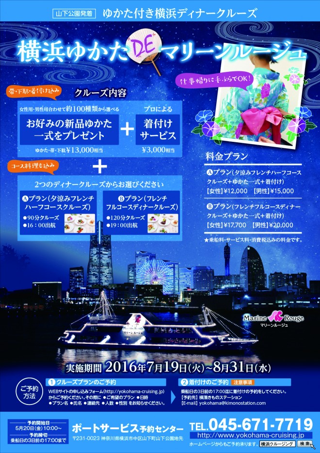 横浜きものステーションとマリーンルージュが夏のコラボレーション。横浜ゆかたdeマリーンルージュがスタートしました。浴衣一式と着付けが付いた横浜クルーズプラン。とてもお得な料金設定をしているので若い方がたくさん参加してくれています。参加者がこの企画を楽しんで夏を満喫してくれている姿が見れてとてもうれしいものです。八月いっぱいの開催ですので是非ご参加ください。お待ちしています。