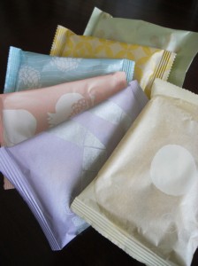6種類の小袋があり、よく見ると「一点文」「二結文」「三果文」「五鯉躍文」「六瓢箪文」「七宝文」と、数字にまつわる日本古来の文様が、きれいなパステルカラーとメタリックで...いや、女郎花、藤色、鴇色、水浅葱、淡萌黄、鬱金色に雲母刷りと言ったほうがいいでしょうか。