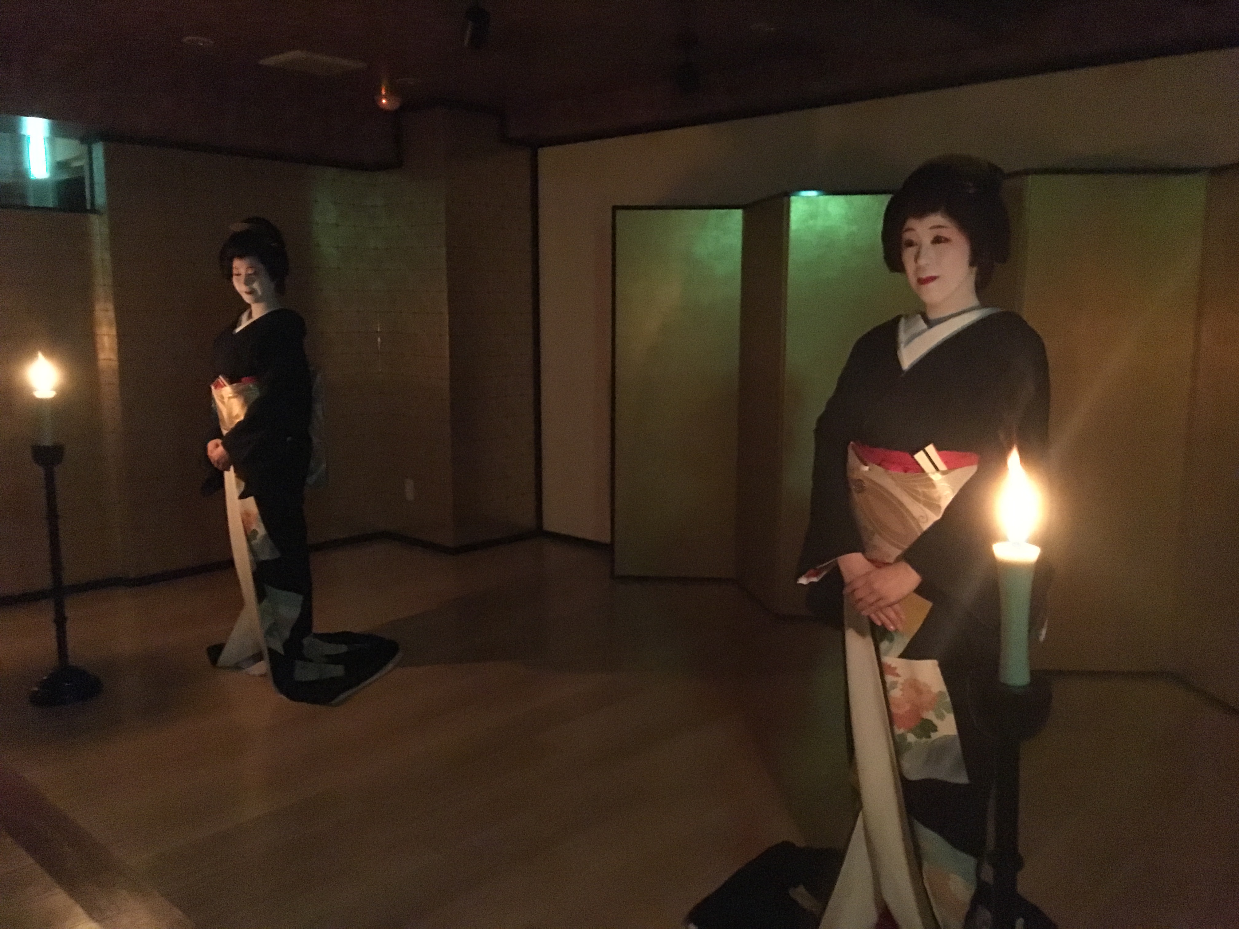 結果は玉ひでの環境では蝋燭灯りだけで芸者とお座敷あそびを体験したもらうのは無理でした。電気の灯りもある程度利用しないと難しかった。