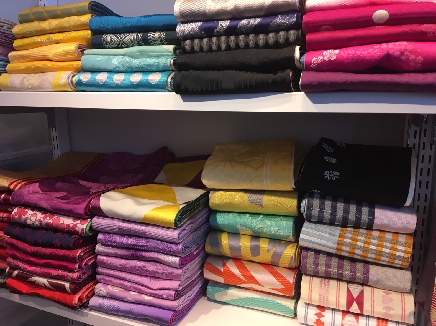カジュアルな半幅帯。好きな色(赤系・ピンク系・紫系・青系・黄色系・グリーン系など)を選べます。着物の色から1色とったり、正反対の色を選んだりとお好みで