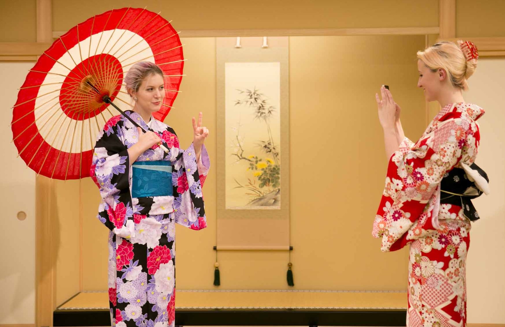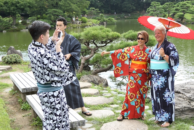 会議室・ホテル・お座敷・庭園などで着物体験。ご希望の場所へ着物一式を発送、着付師が出張して手早く美しく着付けをします。