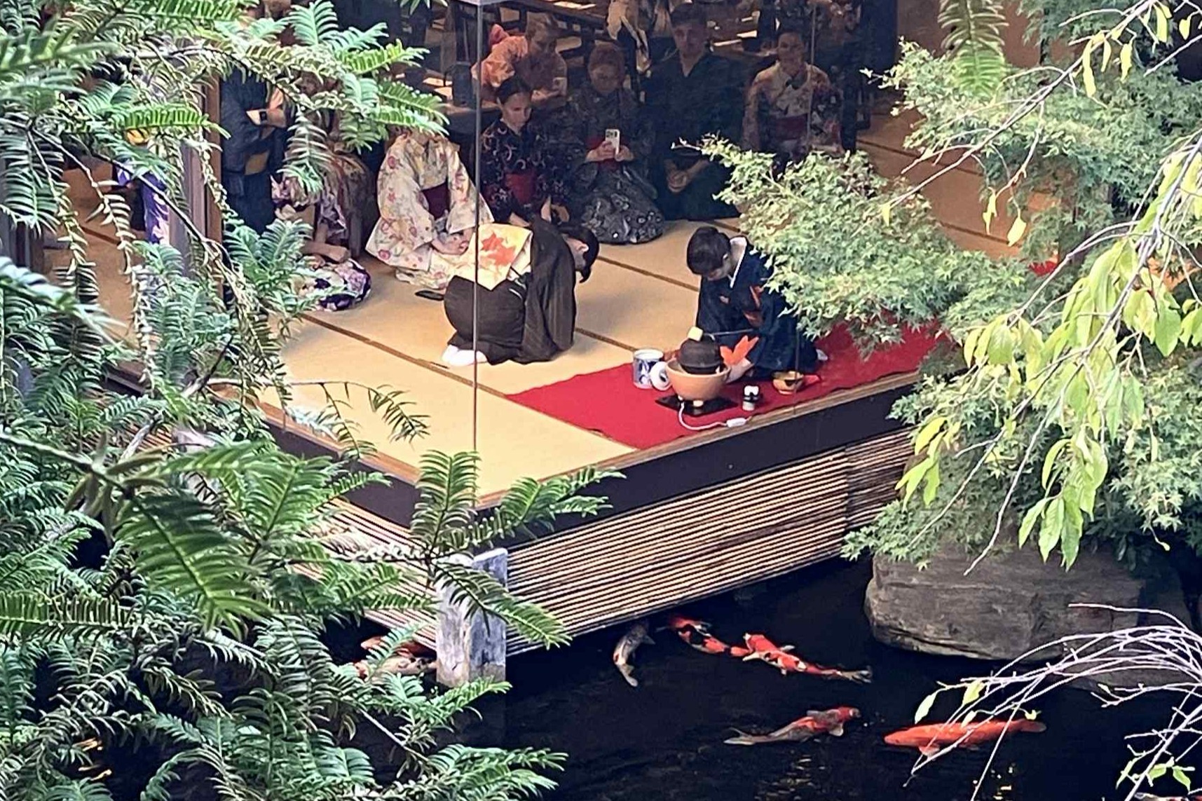 歴史的建造物(旧三菱財閥岩崎別邸)。池のある庭に面した部屋ではガラス越しに自然を感じる野点のような雰囲気を楽しめる。
