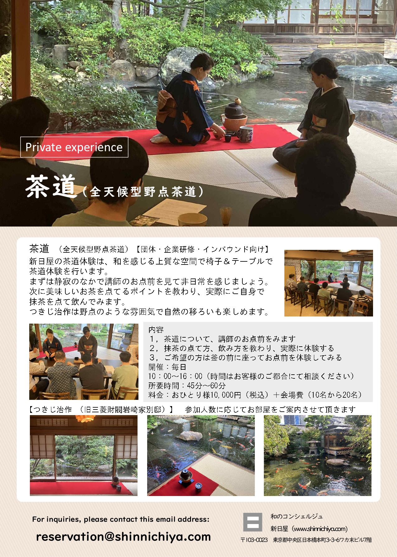 含まれるもの 体験料、講習料、道具レンタル料、抹茶、菓子、室料