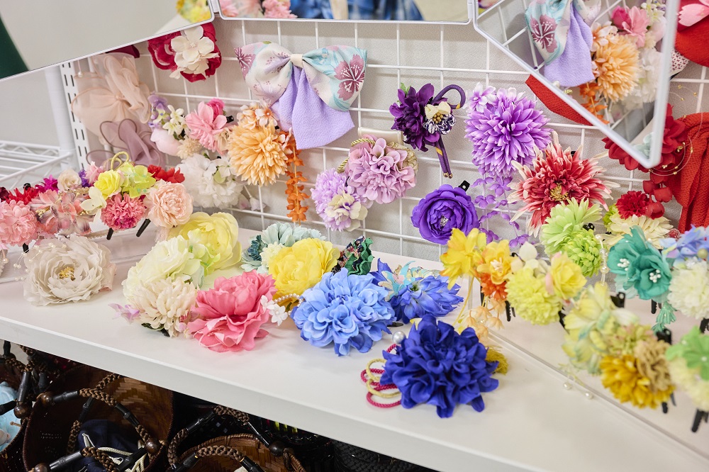 お花クリップを1つ無料レンタル。色や大きさも様々で、オリジナル品もあります。髪飾りは頭の上の方につけると可愛らしく、下の方につけると大人っぽく清楚な雰囲気