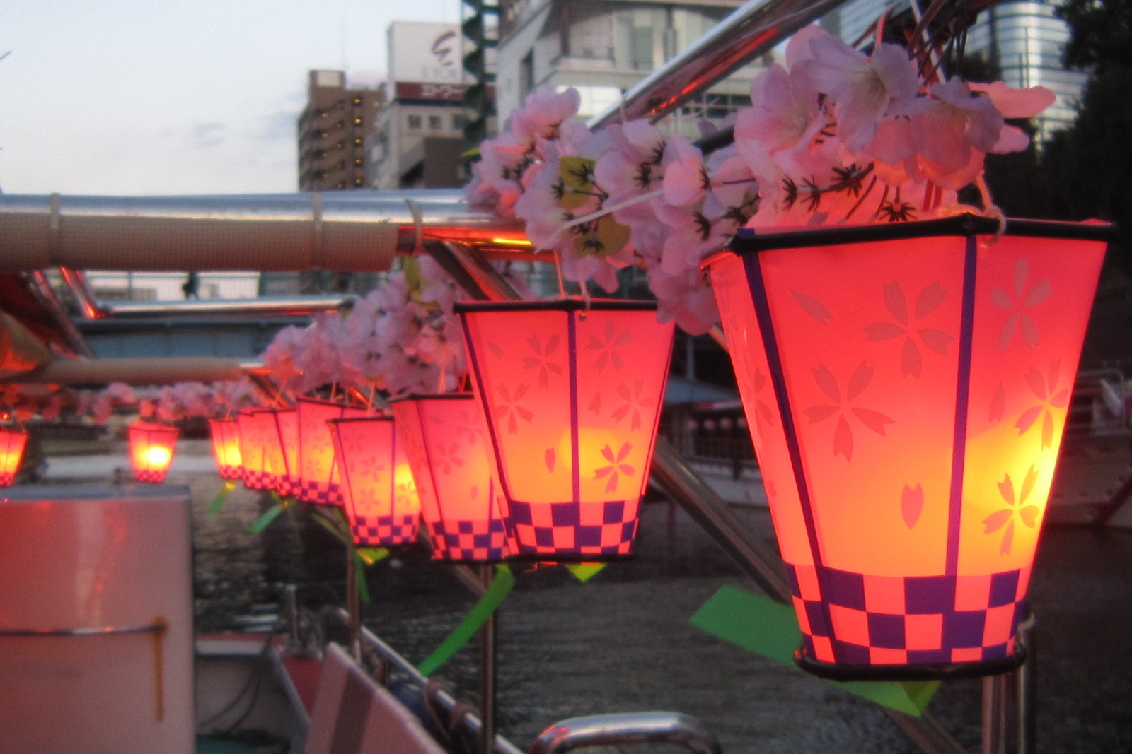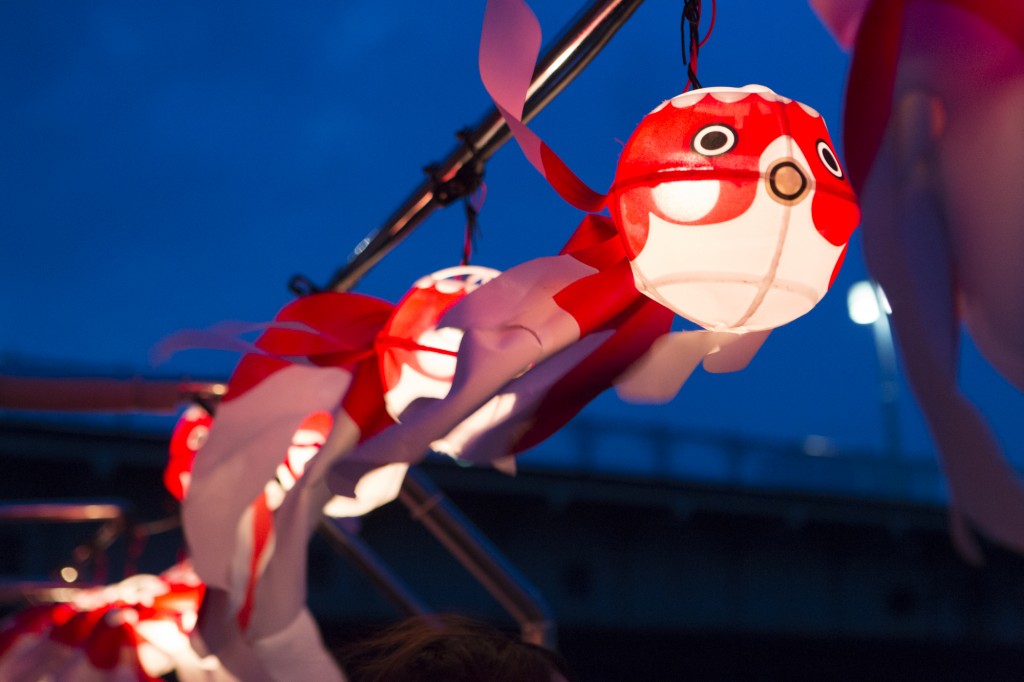 東京スカイツリーと隅田川の橋のライトアップ、金魚ちょうちんの灯りの美しいコントラストをお楽しみください