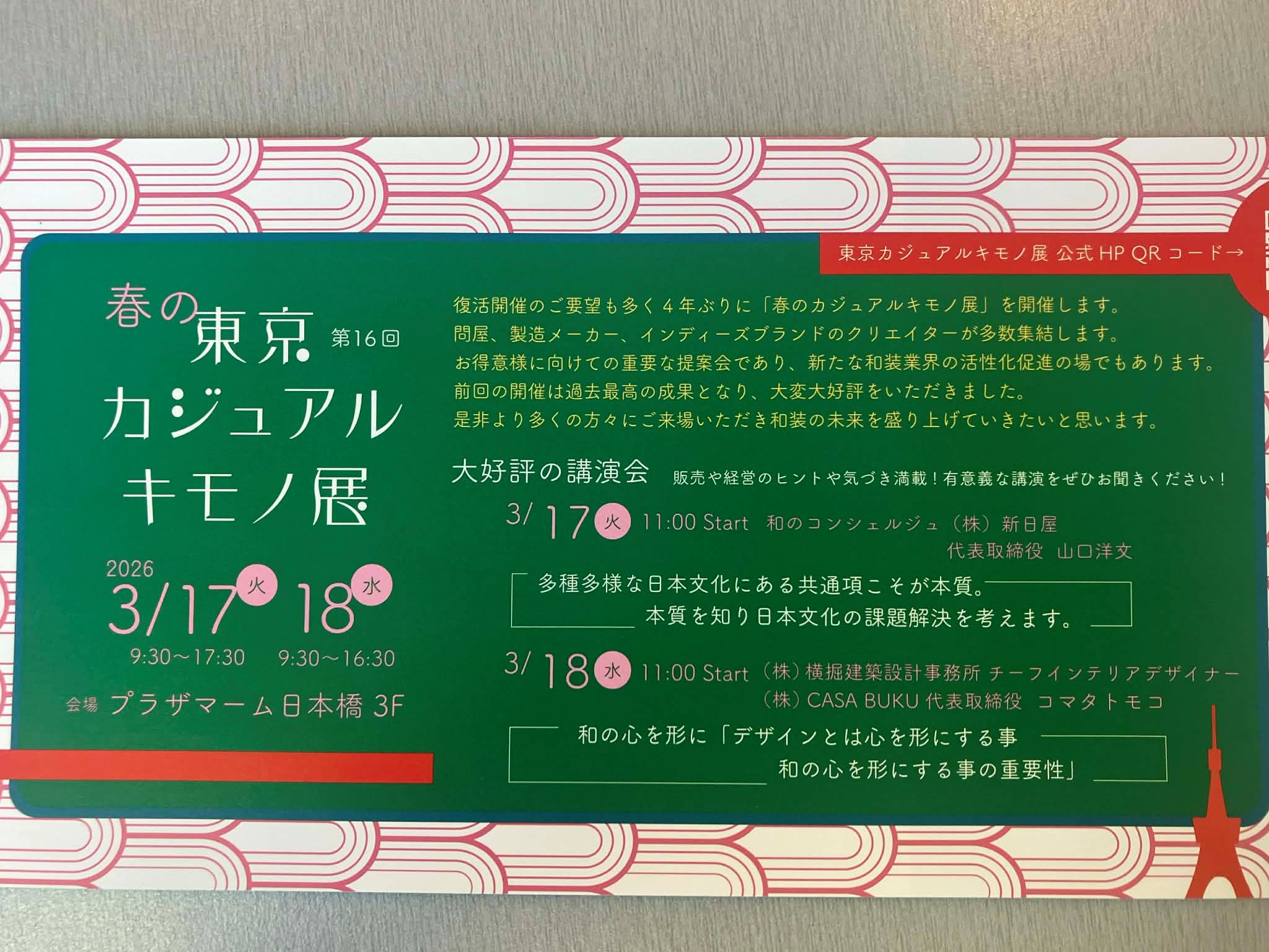 きもの問屋、製造メーカー、インディーズブランドのクリエーターが多数終結するという「春のカジュアルキモノ展」が3月17日(火)、18日(水)に日本橋で開催されます。4年ぶりの復活だそうです。