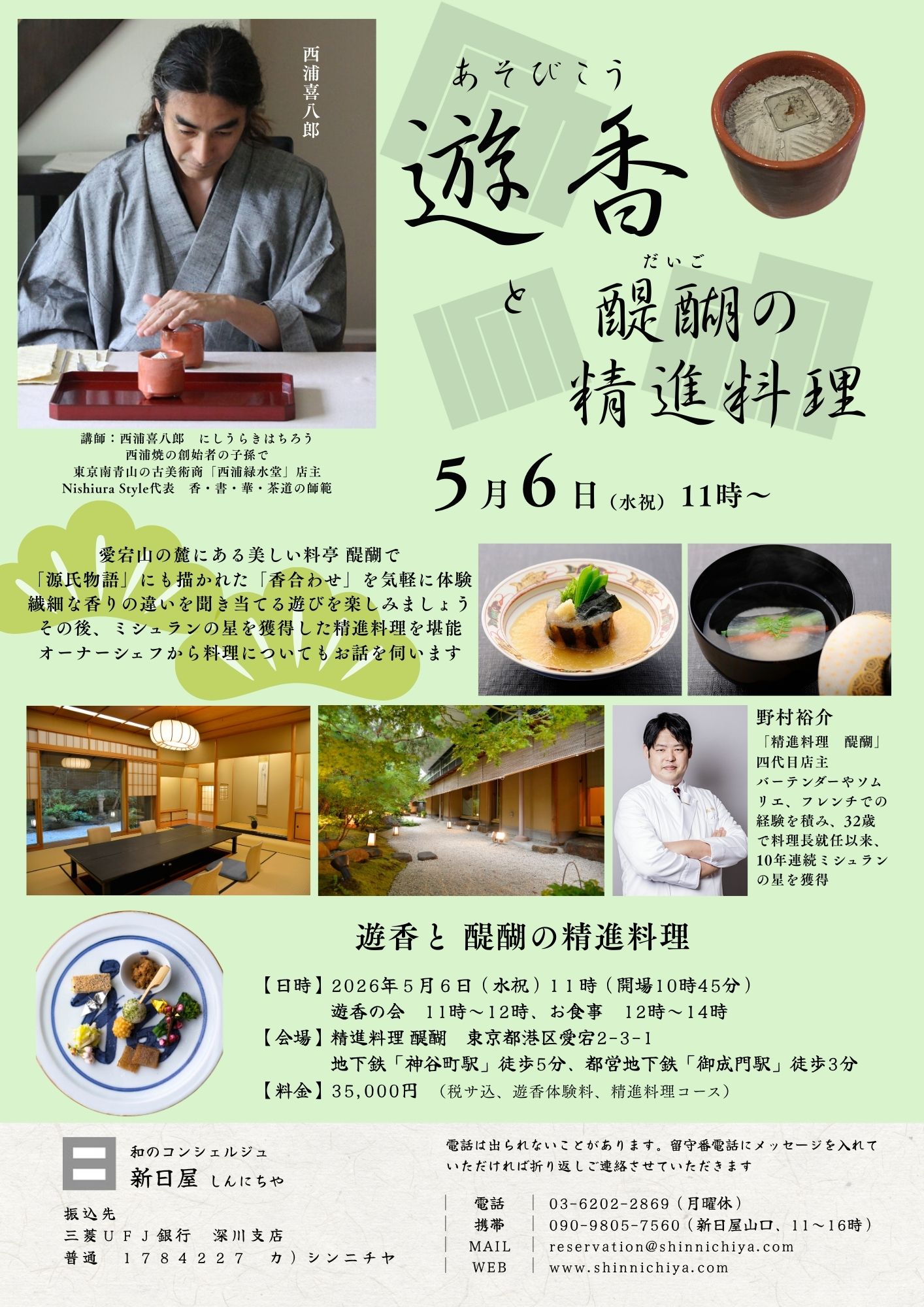 愛宕山の麓にある美しい料亭 醍醐で「源氏物語」にも描かれた「香合わせ」を気軽に体験。繊細な香りの違いを聞き当てる遊びを楽しみましょう。その後、ミシュランの星を獲得した精進料理を堪能、オーナーシェフから料理についてもお話を伺います。
