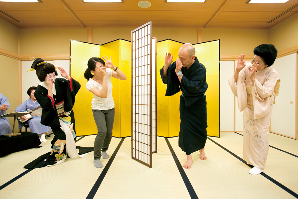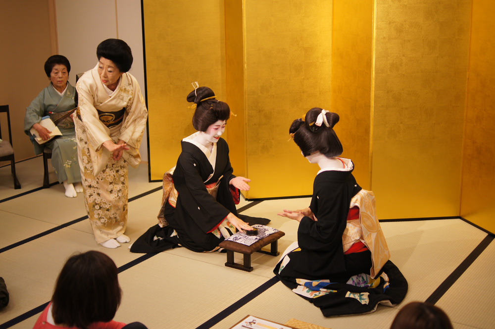 ご当地「お江戸日本橋」の踊りなど3~4曲(約10分間)をご覧いただき、つづいてお座敷遊び(宴席の伝統ゲーム)を3種類。最後は金屏風の前で記念撮影をして終了です(終了は19時の予定)。