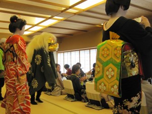 内容はとても盛りだくさんでした。食事、獅子舞、芸者の踊り、お座敷遊びとあっという間の2時間。おひとりで参加された方や新日屋の企画が初めての方などもとてもすんなり楽しめて頂けたようです。それも芸者さんのおもてなしがあってこそです。