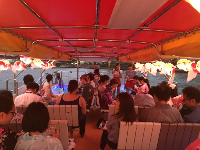 夏もまっさかり。暑い日が続く中、日本橋の船着場から出航するECOEDO日本橋納涼金魚ちょうちん船が大いに盛り上がってきました。6月、7月は雨が多かったのでやっと気分が夏モードになってきたということでしょうか。納涼金魚ちょうちん船に浴衣でくると浴衣特典があったり、船のなかではかき氷が食べ放題だったり、さらにビンゴ大会があったりとワイワイ楽しい船になっています。是非お越しください。夕暮れ時の美しさもいいですし、夜の暗闇の金魚ちょうちんも美しいです。
